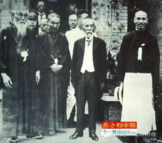 ▲蔣介石(右一)歡迎頭山滿(左一)參加孫中山葬儀
